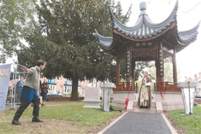 揭幕仪式上,来自中英两国的艺术家在亭中表演了明代古音盱河高腔《牡丹亭》选段以及莎翁经典剧《罗密欧与朱丽叶》选段,吸引了不少附近居民和游客驻足观赏。