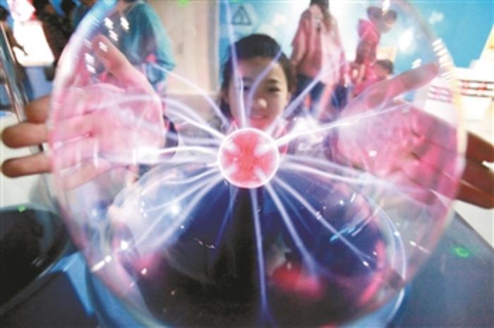 5月3日,小朋友在江苏省扬州科技馆体验“辉光球”。“五一”小长假期间,人们走进博物馆、科技馆等场所,度过一个充实的假期。 新华社发(孟德龙 摄)
