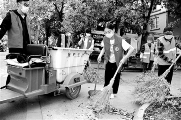5月5日,大学生志愿者与环卫工人一起清扫小区。