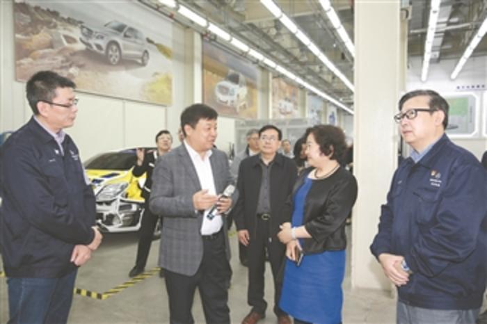 北京市总工会党组书记、副主席郑默杰(右二)在北汽集团就产业工人队伍建设进行专题调研