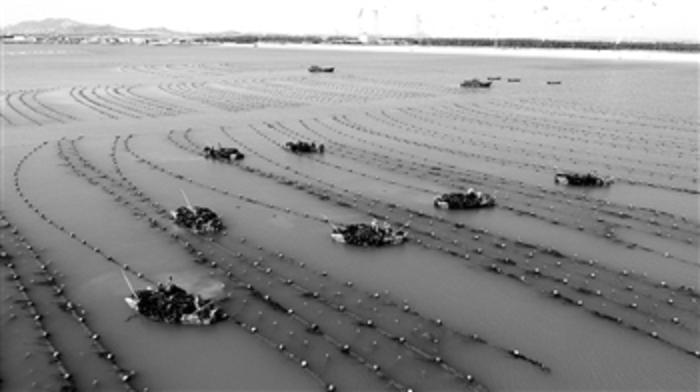 5月6日,山东省荣成市石岛管理区东楮岛海带养殖区,养殖工人在往岸上运送收割的海带。进入5月,荣成海带迎来收获旺季,在荣成数百公里的海岸线上,到处是收获海带的繁忙景象。