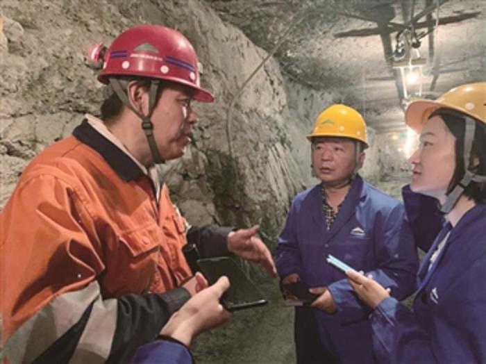 本报记者康劲(中)在金川集团龙首矿采一区井下采访。