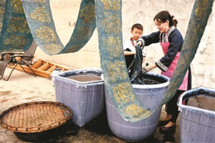 5月6日,冉光津(右)在惠水县的家中给“枫香染”工艺服饰染色。