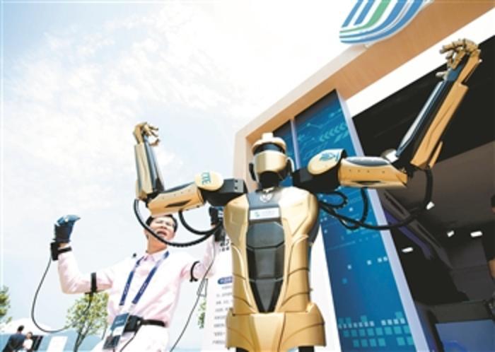 图为在峰会现场,展商展示一款同步模拟人体动作的机器人。