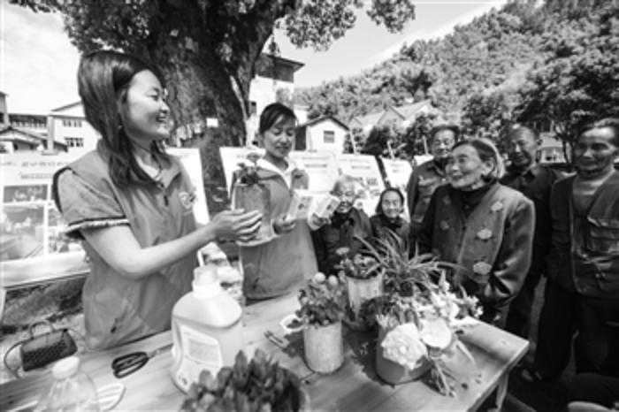 5月7日,湍口镇迎丰村的党员志愿者在“乡村流动课堂”上给村民普及垃圾分类知识,并介绍如何变废为宝,用废旧物品美化环境。
