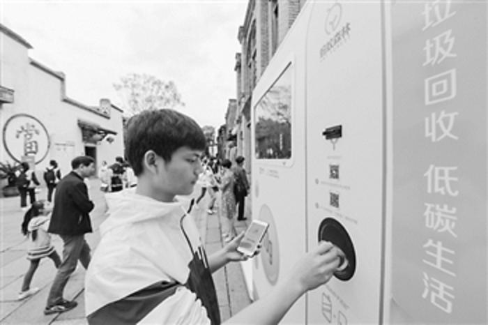 5月5日,在福州市三坊七巷历史文化街区,游客扫码后将废弃饮料瓶投入数字化智能回收设备中,换取环保书签。在第二届数字中国建设峰会会议期间,福州市政府将有着悠久历史的三坊七巷历史文化街区打造为“数字街区”,引入多项技术,提升游客在“吃、购、游、住、行”等方面的数字体验,让古街焕发“数字生机”。