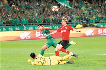 5月12日,北京中赫国安主场迎战深圳佳兆业,双方球员在比赛中争球。