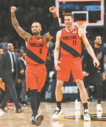 5月12日,在2018~2019赛季NBA季后赛西部半决赛第七场比赛中,波特兰开拓者队客场以100比96战胜丹佛掘金队,以总比分4比3晋级西部决赛。图为开拓者队球员利拉德(前)在比赛后庆祝。 新华社/路透