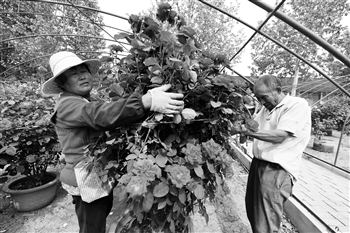 5月14日,工作人员在天津市园林花圃月季花生产基地捆扎即将销售的月季花。