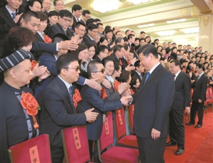 上午11时,习近平等来到人民大会堂北大厅,全场响起热烈掌声。习近平等同代表们热情握手,关切地询问他们的工作生活情况,并同大家合影留念。