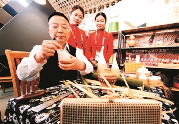 5月16日,竹编艺人张德明在演示竹编工艺品制作。当日,由国际竹藤组织主办的荣誉日活动在北京世园会园区的国际竹藤组织园举行。 新华社记者 李欣 摄