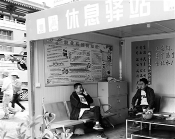 日前,在位于西安市西大街的西安地铁六号线建设工地“休息驿站”,中铁电气化局铁路工程公司的两位建设者各自坐在椅子上打电话、喝茶、小憩。建立“休息驿站”是这个项目部实施人性化管理的一项举措。 倪树斌 摄