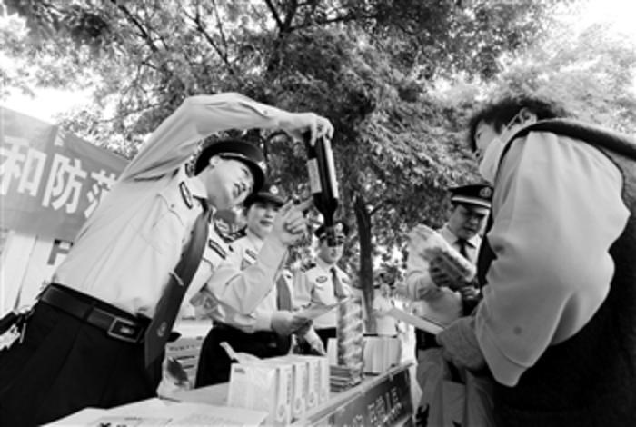 5月15日是第十个全国公安机关打击防范经济犯罪宣传日,山东省曹县警方在全县开展主题宣传活动,在现场向群众提供法律咨询、讲解假冒伪劣产品、真假人民币识别方法和非法集资和传销等知识。图为民警向群众讲解如何辨别假冒伪劣产品。