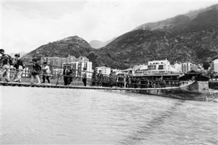 图为日前四川省泸定县泸定桥上,游人如织。红军当年“飞夺泸定桥”事迹家喻户晓。近年来,当地借此探索出一条红色旅游与绿色生态旅游融合发展的新路子,吸引越来越多的游客来这里探访。