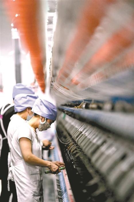 在位于固原市经济技术开发区的宁夏丰源纺织厂,工人在机台上忙碌(5月18日摄)。