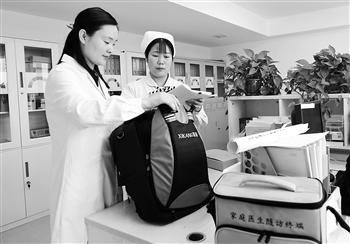 5月17日,在西安市雁塔区电子城社区卫生服务中心,家庭医生郭飞燕(左)和护士席婷婷整理入户随访设备。