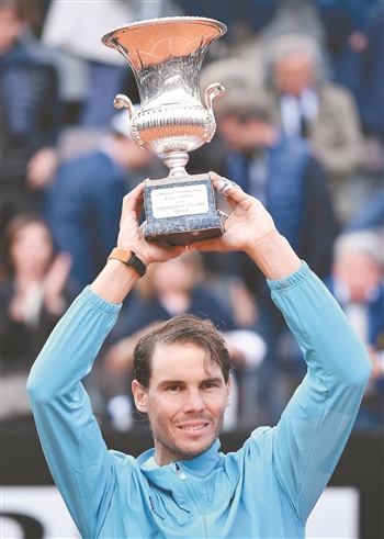 5月19日,在罗马进行的意大利网球公开赛男单决赛中,西班牙“红土之王”纳达尔以6:0、4:6、6:1击败世界第一焦科维奇,第九次问鼎赛事冠军。这是纳达尔生涯第34个ATP1000赛事桂冠,他得以在该级别赛事夺冠次数榜上再次独享头把交椅。