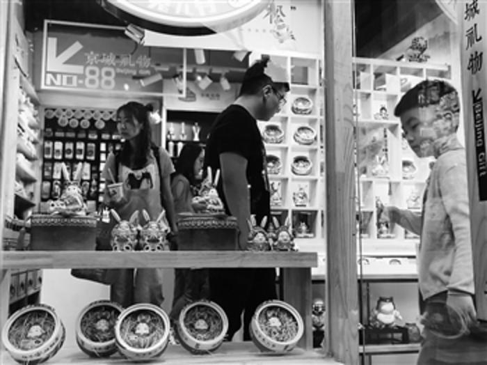 5月20日,在北京东城区南锣鼓巷的一家旅游纪念品商店里,传统手工艺品兔爷也卖起了萌,形态各异的兔爷摆件吸引了游客进店选购。本报记者 王维砚 摄