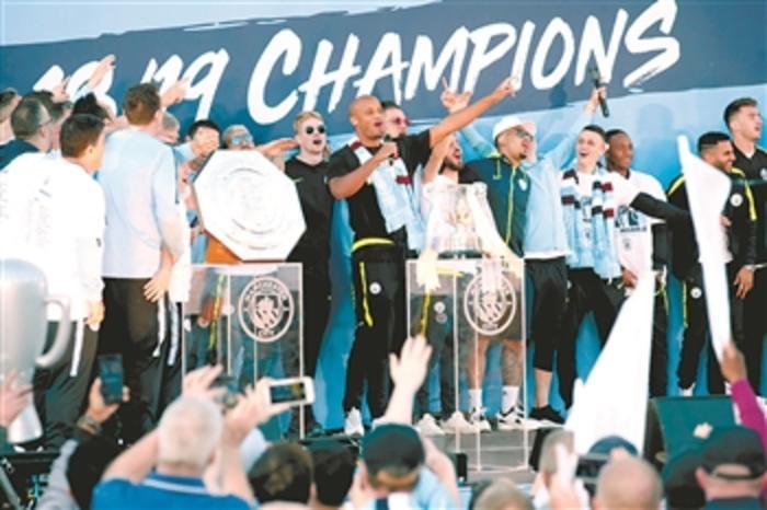 当日,英超曼城队在曼彻斯特举行庆祝活动。曼城队18日在足总杯决赛中战胜沃特福德队夺冠,成为英格兰足球历史上首个在单赛季同时拿到英超冠军、足总杯冠军和联赛杯冠军的本土赛场三冠王。