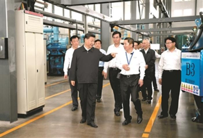 5月20日至22日,中共中央总书记、国家主席、中央军委主席习近平在江西考察,主持召开推动中部地区崛起工作座谈会并发表重要讲话。这是习近平在江西金力永磁科技股份有限公司考察,了解企业生产经营情况。 新华社记者 谢环驰 摄