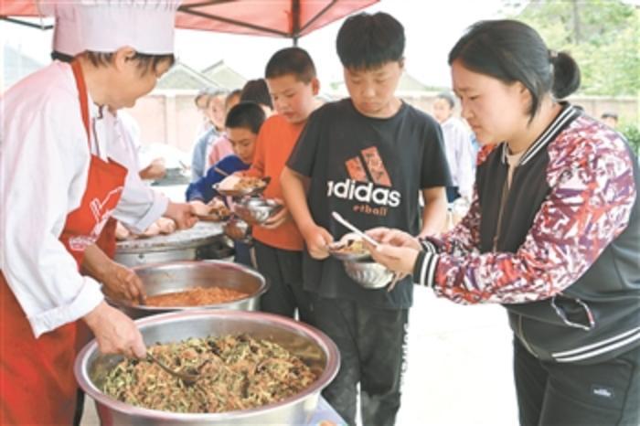 中午下课铃声一响,山西省万荣县高村乡丁樊小学的110名学生便走出教室,来到食堂门口等候开饭。饭前履行一个学生们熟知的“礼仪”——让午餐照片“上网”。 丁樊小学的学生大多是留守儿童。2015年9月,学校加入“免费午餐”公益项目。为了保证午餐开销和制作公开透明,老师们将备餐用餐情况拍照记录,上传到“山西省万荣县丁樊小学”微博账号,公示菜单、原材料数量、购买费用、用餐人数等信息,近4年来共发布了1800余条微博。 图为教师孙引丽(右一)在拍摄当日的学生午餐。