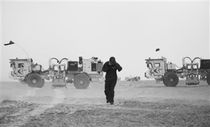 5月20日,在柴达木盆地的狂风中,中石油物探员工在进行石油勘探作业。