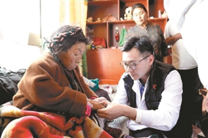 5月26日,在西藏曲水县达嘎乡三有村,医务志愿者(前右)为患者检查身体。