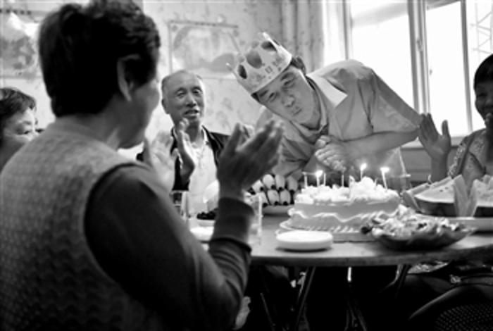 5月26日,河南省濮阳市中原油田社区世纪景苑居民区“抱抱团”成员一起为83岁的宇文仲老人过生日。