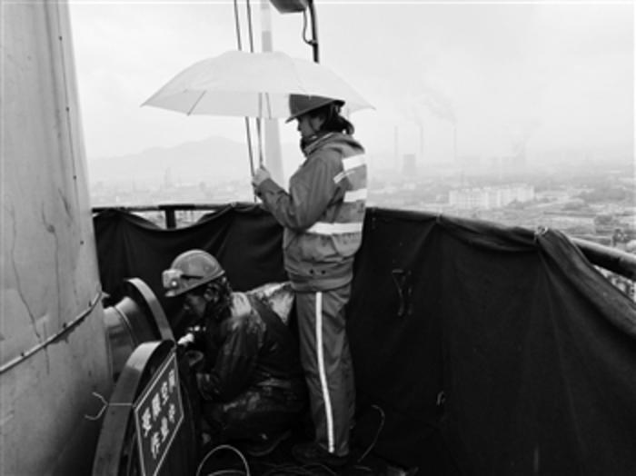 5月5日至6日,地处西北的甘肃省兰州市出现少有的连续降雨天气,最低气温跌到10摄氏度以下。在中国石油兰州石化公司乙烯厂丁二烯装置检修现场,维修工顶风冒雨奋战在相当于30层楼高的高塔上。