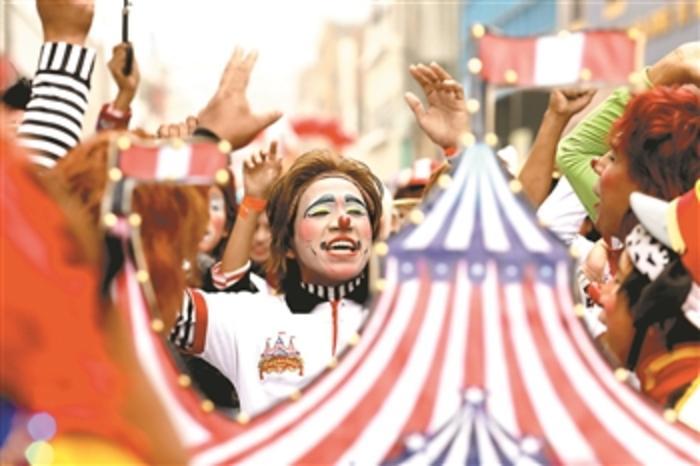 5月25日,在秘鲁首都利马,小丑扮演者参加街头巡游。