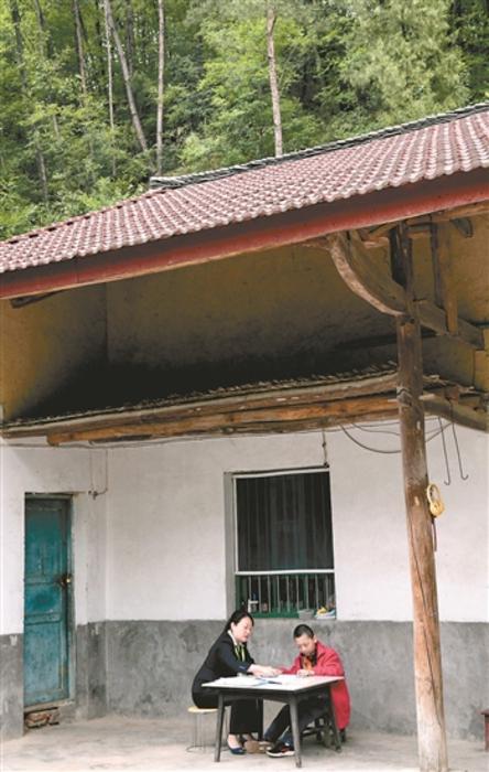 5月27日,陕西省略阳县何家岩小学老师张婷(左)在接官亭镇上院子村杏树坪组送教上门,辅导残疾学生谭杨慧。