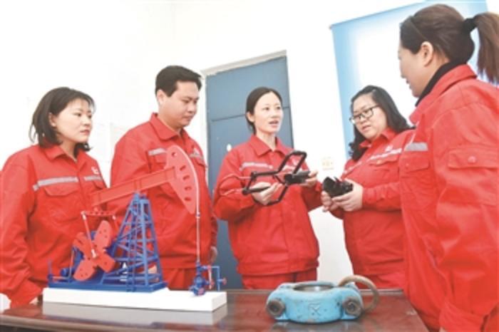 为缩短更换油井盘根时间,单芳(左三)与员工一起研究革新方案。 (吴木水 摄)