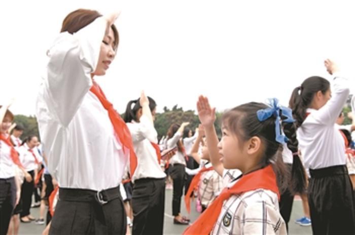 5月29日,在广西南宁市滨湖路小学,家长和新入队小朋友互敬少先队队礼。