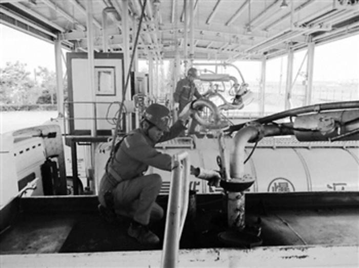 为了提升效率增加安全系数,中国石化西北油田油气运销部雅克拉末站通过优化人员、车辆、装油等一系列工艺升级,实现了24小时风雨装车不间断,装一辆车较以前减少20分钟时间,装油效率大幅提升。图为该站工人站在经过改造升级的装车栈桥遮挡棚下进行紧张的原油罐车装车作业。 李瑞芝 张建国摄