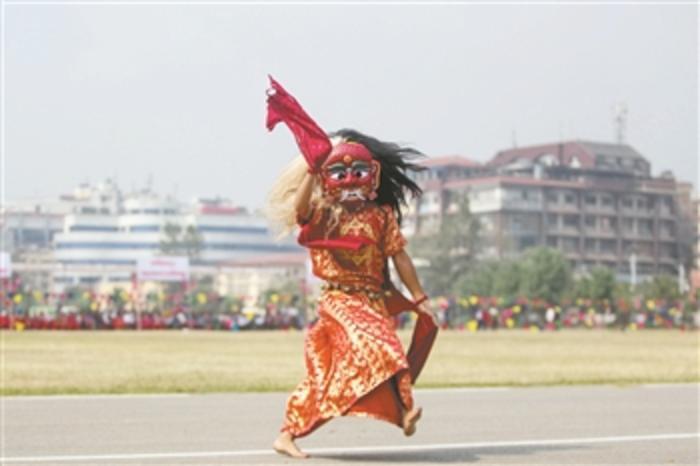 5月29日,在尼泊尔加德满都,一名戴面具的舞蹈演员在共和日庆祝活动上表演。新华社发(苏拉弗·什雷斯塔 摄)