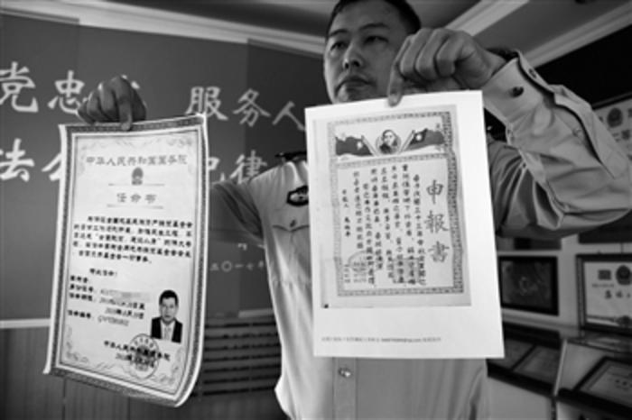 5月29日,沈阳市公安局通报沈阳警方打掉“中国梦想起航基金会”诈骗团伙,抓获犯罪嫌疑人14名。该团伙通过假冒国家民政部门领导、伪造国家公文等方式,以扶贫、民族资产解冻为幌子,利用微信群拉拢会员、发展下线人员,有组织地实施诈骗犯罪活动。图为5月29日,民警展示诈骗犯罪团伙伪造的证书。黄金崑 摄/东方IC