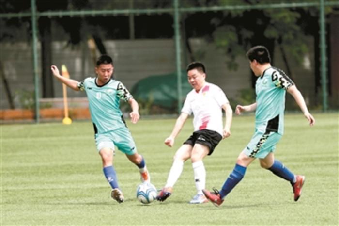 5月30日,全总机关足球队与中国人寿足球队在比赛中。当日,“健身你我他 奋进新时代”中央和国家机关职工运动会足球比赛在国家奥林匹克体育中心鸣锣开赛。本报记者 王伟伟 摄