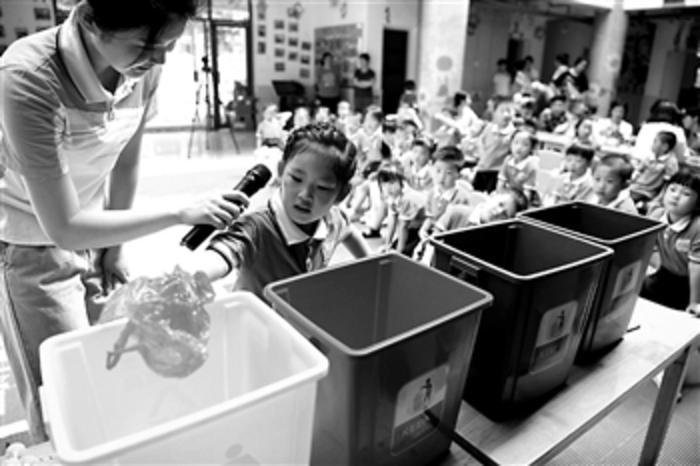 6月3日,紫竹苑幼儿园的孩子们在进行垃圾分类环保小游戏。