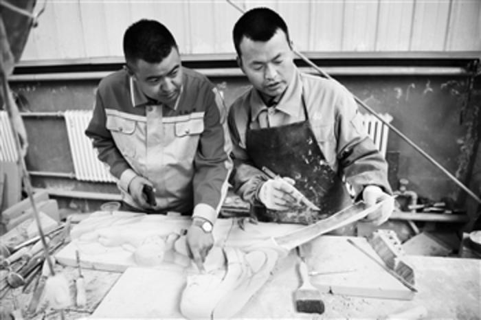 5月31日,在甘肃省临夏县一砖雕公司,工作人员在商讨砖雕制作方案。