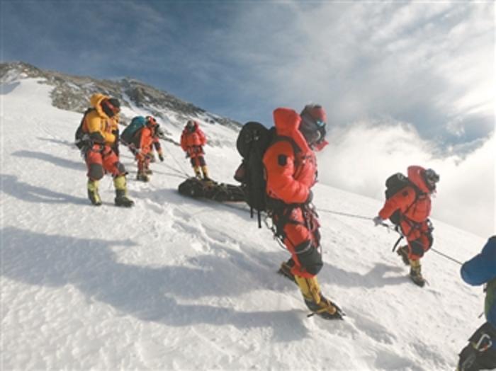 5月22日,救援人员正在珠峰海拔7300米左右的高度下撤遇险者。