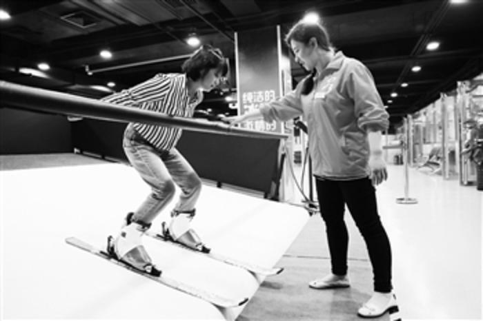 6月3日,北京西城区白纸坊街道冰雪体验中心内,一位女士正在铺满仿真雪的斜坡上练习滑雪动作,该冰场是西城区首个街道层级的冰雪体验中心,附近小区居民只需要提前预约即可在家门口体验冰雪运动。