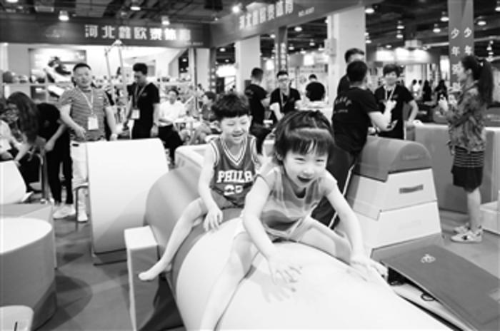 6月4日,北京国际体育用品展览会于国家会议中心开幕,孩子们在体验儿童体适能器材。