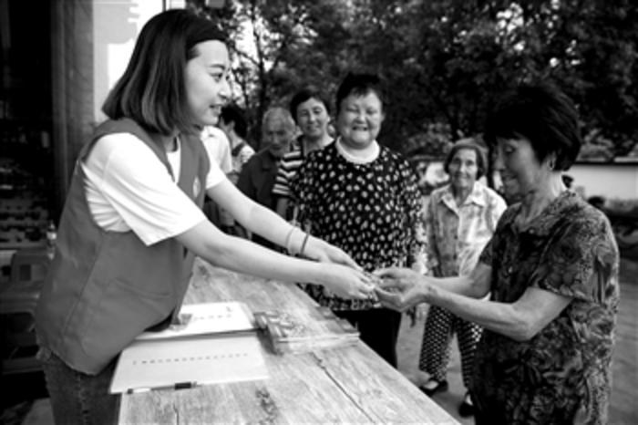 6月6日,在长兴县虹星桥镇郑家村的便民服务代办点,党员志愿者为村民发放老年人公交IC卡。