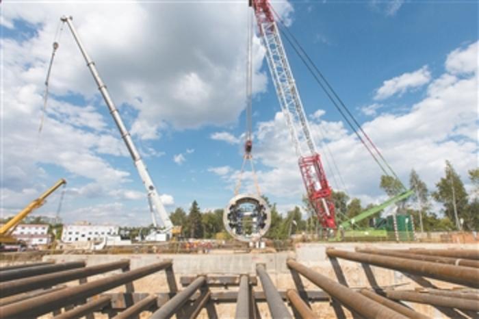 两年前,中国铁建股份有限公司(中国铁建)赢得竞标,承建莫斯科地铁第三换乘环线3个车站主体结构和部分隧道工程。“攻坚克难”成为中国铁建这两年来在建设中的关键词。图为在俄罗斯首都莫斯科,起重机吊装盾构机核心部件。新华社记者 白雪骐 摄