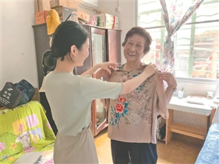 在李和静的帮助下,冯奶奶“淘”到了一身好看的新衣服。 本报记者 于灵歌 摄