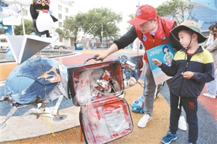 6月5日,志愿者薛操(左)在为一名小男孩介绍用海洋垃圾创作出的作品《绝望的大鱼》。该作品展示海洋动物误食各种垃圾后的状态。