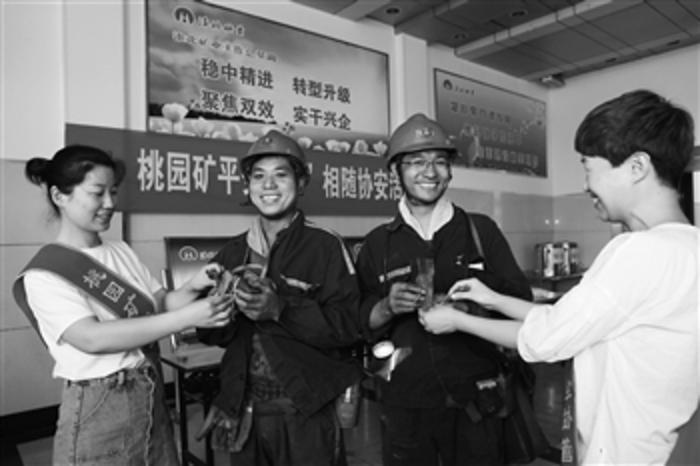 “师傅,吃个平安粽,祝您端午节安康!”6月5日,安徽淮北矿业集团桃园矿工会女工部组织协安员在井口候罐室开展“平安粽”相随活动。她们为一线矿工准备了香甜可口的粽子、热气腾腾的茶叶蛋、清凉解渴的绿豆汤,在送上端午节祝福的同时,叮嘱矿工师傅在百米井下工作时牢记安全。