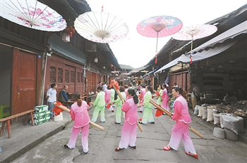 6月6日,丙安古镇的居民在跳竹梆舞。当日,一场“我们的节日”端午主题活动在贵州遵义赤水市丙安古镇举行,当地居民跳起竹梆舞,参加包粽子比赛,迎接即将到来的端午节。 新华社记者 郑雅宁摄