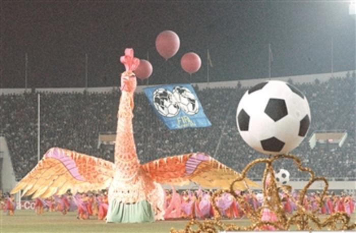 图为1991年11月16日,首届世界女子足球锦标赛在中国广东省广州市天河体育中心体育场开幕,这是开幕式上的文体表演《金凤展翅》。 新华社记者 姜恩宇 摄
