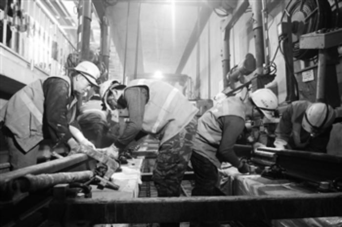 6月11日,北京地铁7号线东延小马庄站施工现场,工作人员正在铺轨作业。